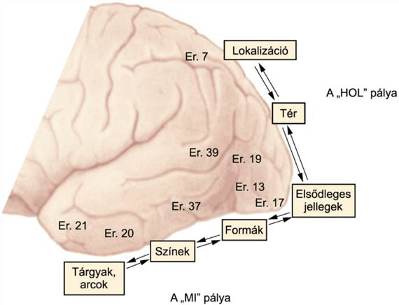 A vizuális információ elsődleges feldolgozása után egy magasabb szintű feldolgozási szakasz következik. A vizuális inger a látókéregből két útvonalon halad tovább: a dorzális és a ventrális pályákon. A két szó, a dorzális és ventrális ezek elhelyezkedésére utal. A dorzális jelentése hátoldali, vagyis az idegpályák az agy hátsó, felső oldalán futnak, míg a ventrális hasi oldalit jelent, vagyis a pályák az agy alsó, oldalsó részén húzódnak. A kétféle útvonal nagyon jellegzetesen különbözik egymástól, más észlelési módok megvalósításáért felelősek, ugyanakkor egymással kapcsolatban is állnak.